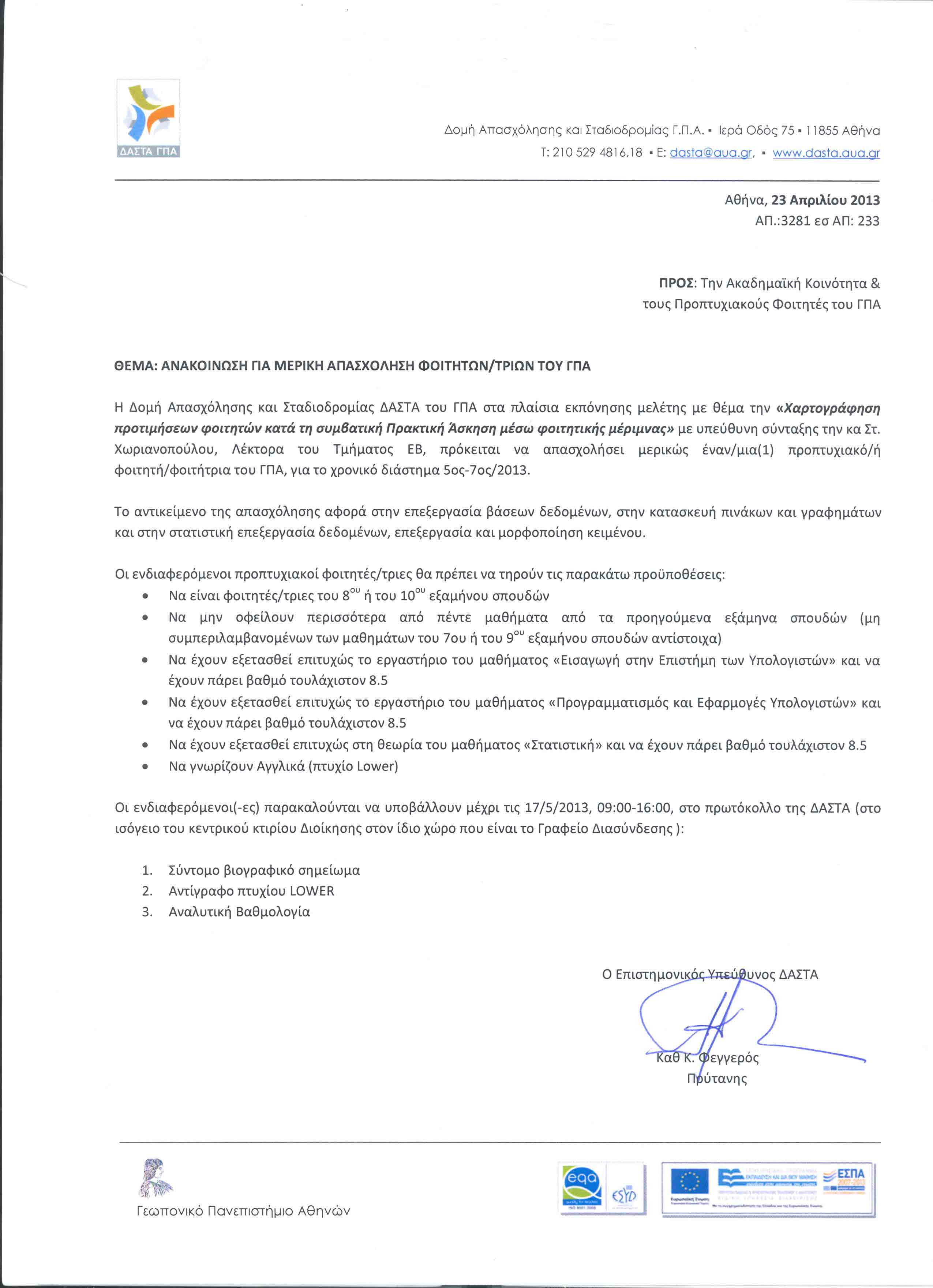 Οι ενδιαφερόμενοι προπτυχιακοί φοιτητές/τριες πρέπει να τηρούν τις προϋποθέσεις που φαίνονται στο επισυναπτόμενο αρχείο και παρακαλούνται να υποβάλλουν μέχρι τις 17/5/2013, 09:00-16:00, στo πρωτόκολλο της ΔΑΣΤΑ (στο ισόγειο κεντρικού κτιρίου Διοίκησης στον ίδιο χώρο που είναι το Γραφείο Διασύνδεσης):