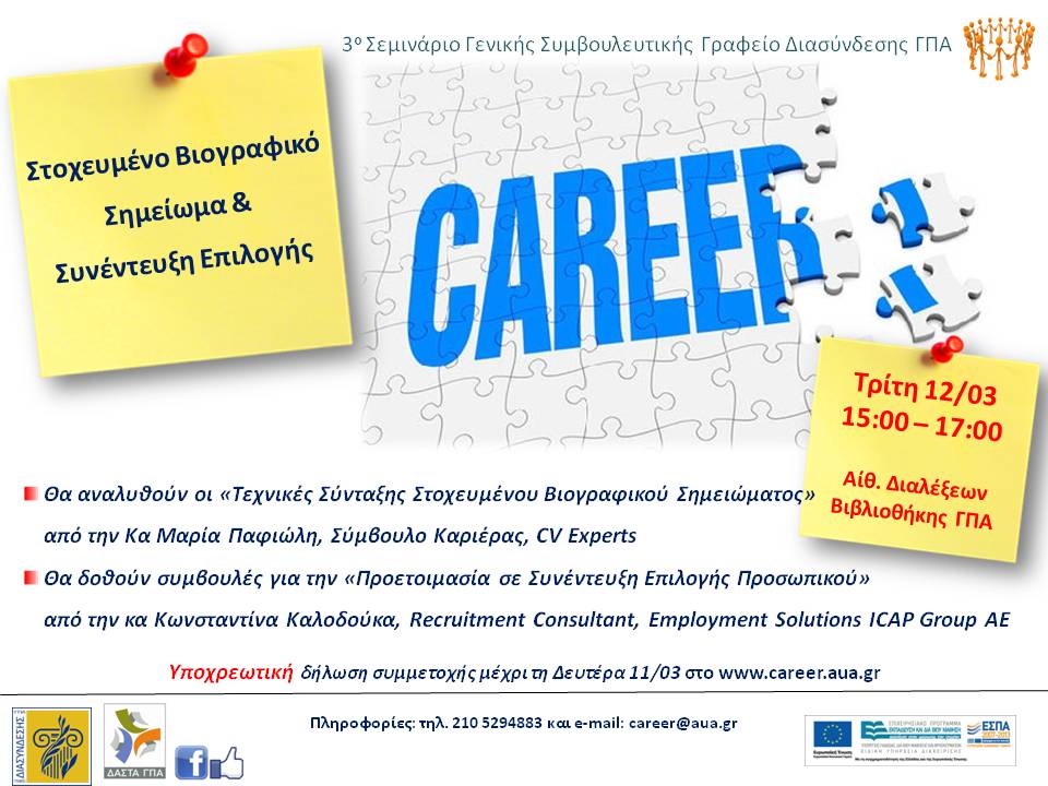 Η Δομή Απασχόλησης και Σταδιοδρομίας (Δ.Α.ΣΤΑ.) και το Γραφείο Διασύνδεσης του Γεωπονικού Πανεπιστημίου Αθηνών, στο πλαίσιο της «Ημέρας Καριέρας 2013» σας προσκαλούν την Τρίτη 12 Μαρτίου 2013, 15:00 – 17:00 στην Αίθουσα Διαλέξεων της Βιβλιοθήκης ΓΠΑ στο Σεμινάριο Γενικής Συμβουλευτικής με θέμα: